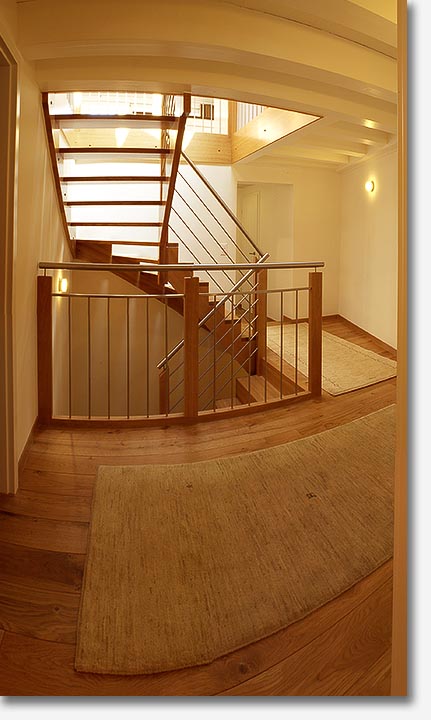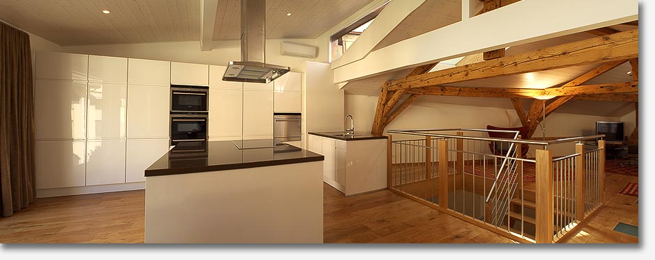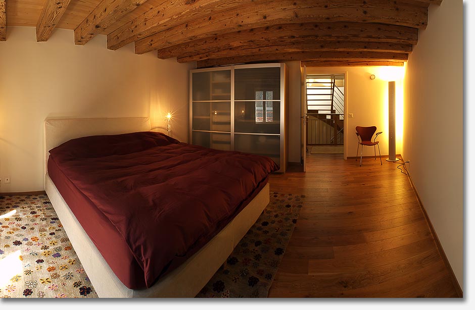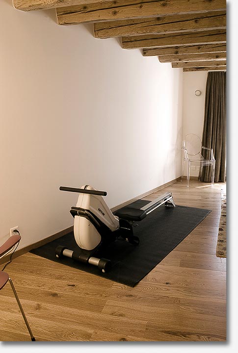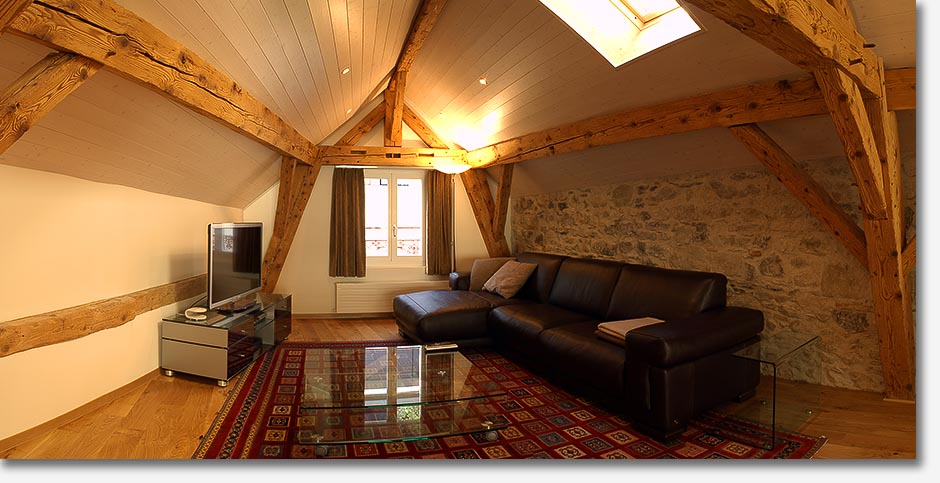 Beautiful wood beams, stonework and light fill the apartment that showcases beautiful,