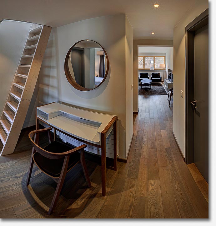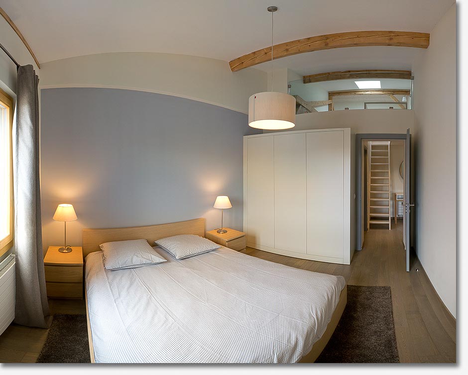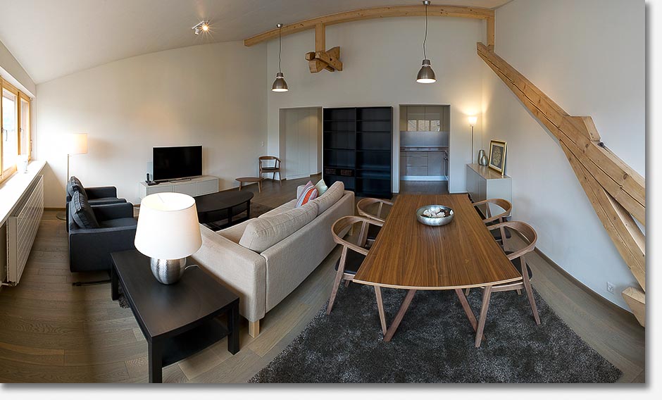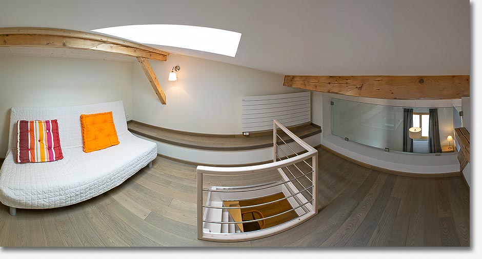 the unique atmosphere of its wooden beams, mezzanine and open-space kitchen. Adjacent to
