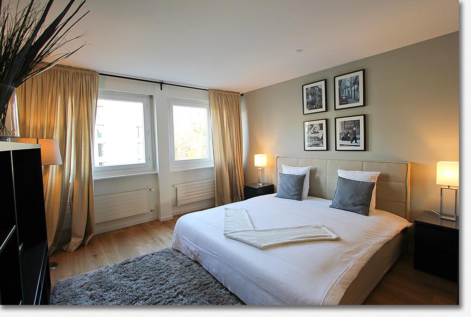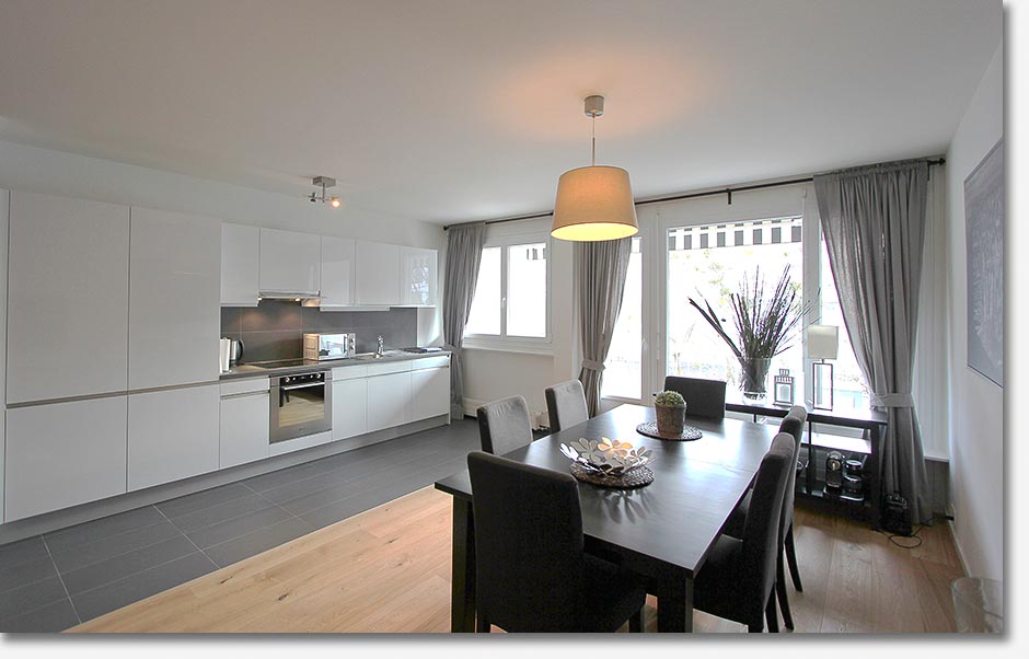 The apartment is located in a contemporary style building in the Servette district. Close to the